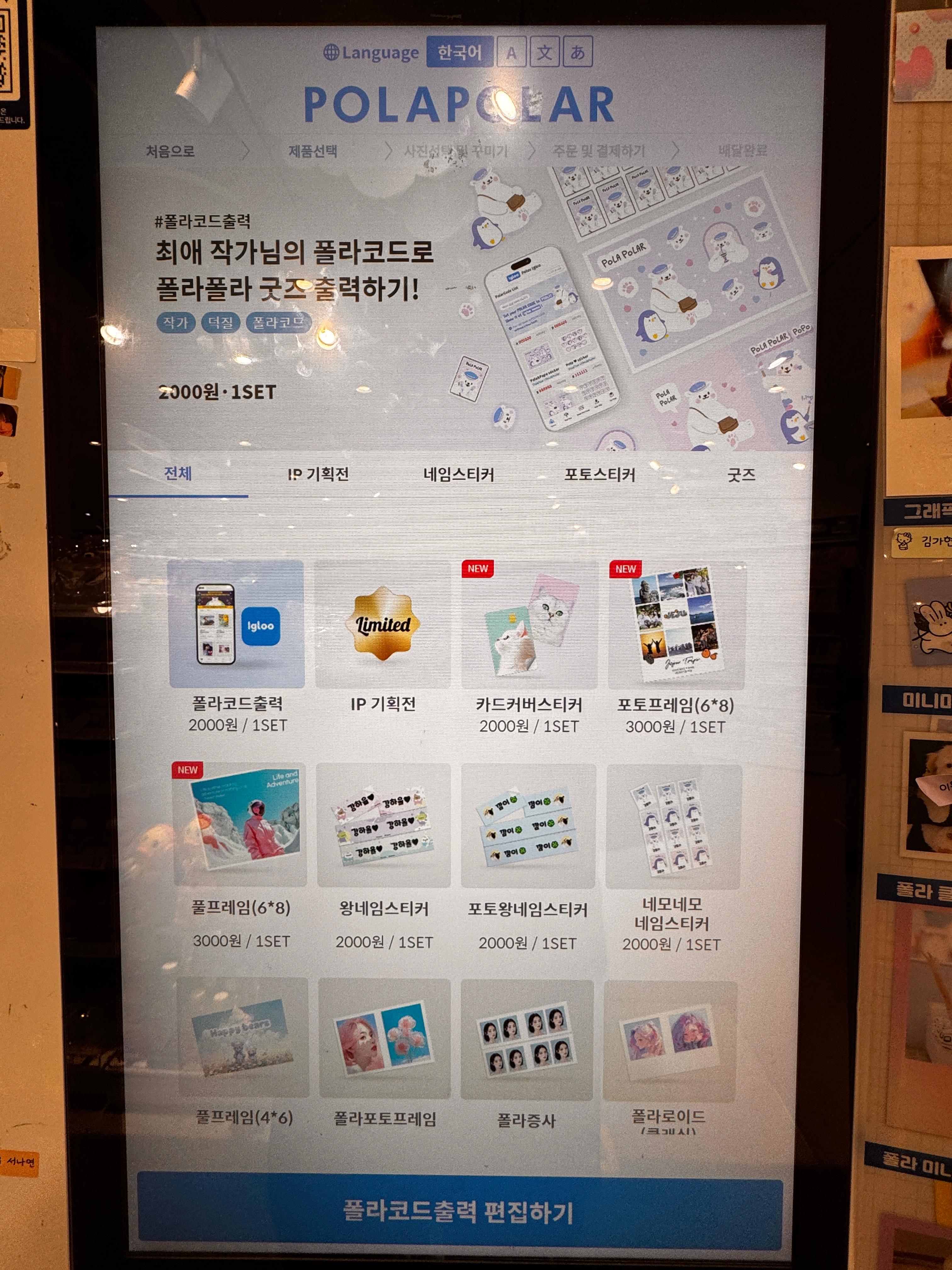 - 코드 입력 및 결제: 기기 화면에서 [폴라폴라] 메뉴 선택 → 코드 입력 → 2,000원 결제 (1분 이내 출력 완료!)